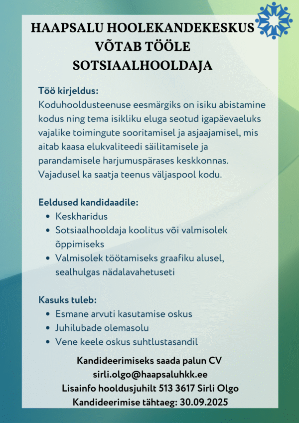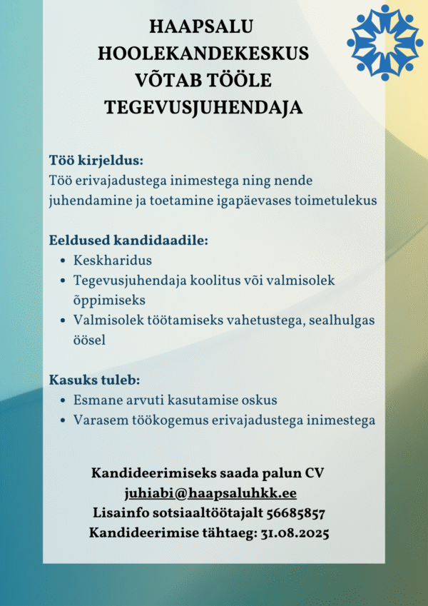 Lisainfo: Annaliisa Täht (Haapsalu Sotsiaalmaja direktor) tel 473 5061, 58662323, annaliisa@sotsmaja.ee